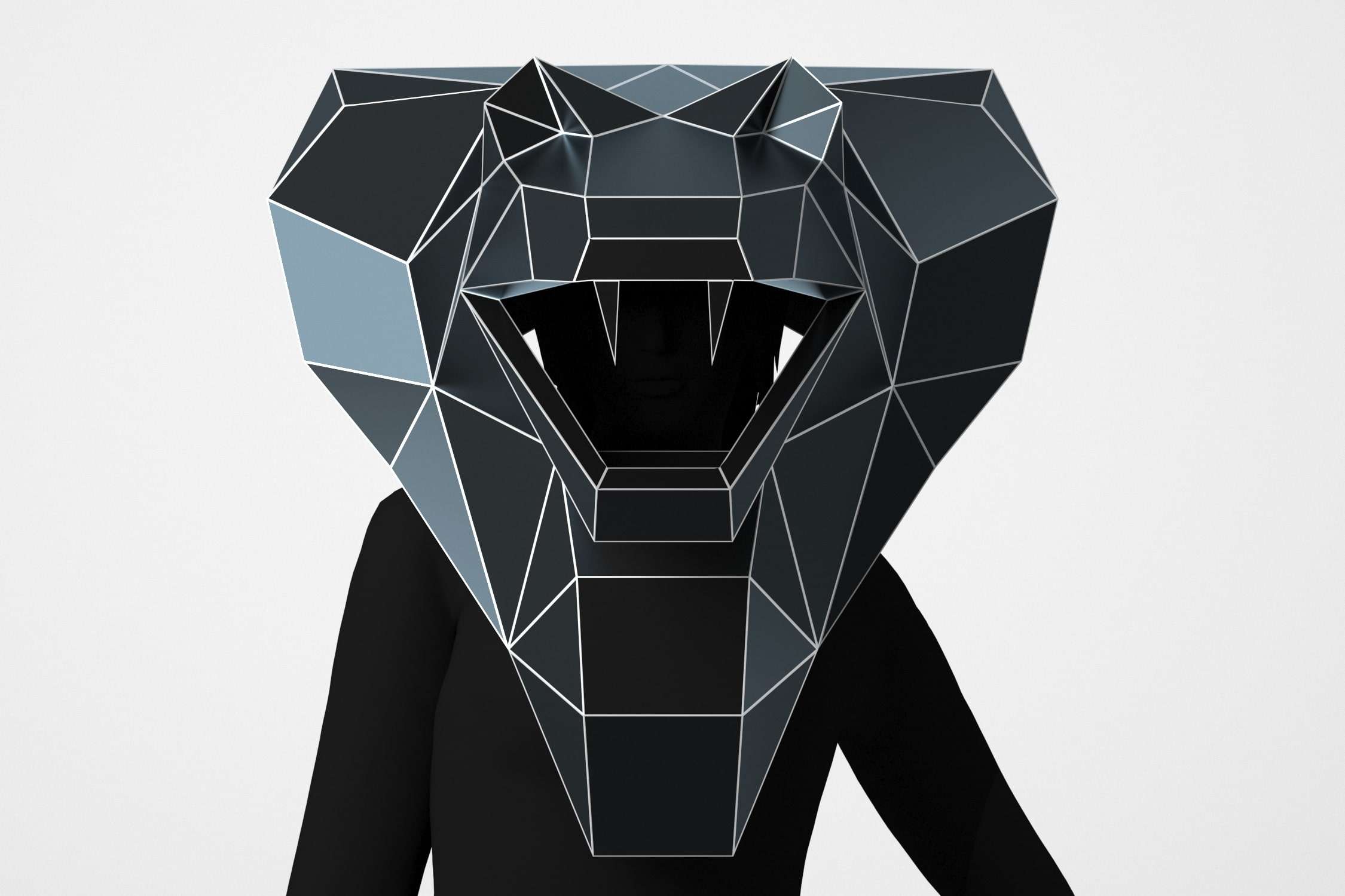 A snake mask with a more pronounced, angular structure. The geometry is sharper compared to the female version, giving the face a heavier and more defined expression. The overall size is slightly larger, making it stand out when worn.