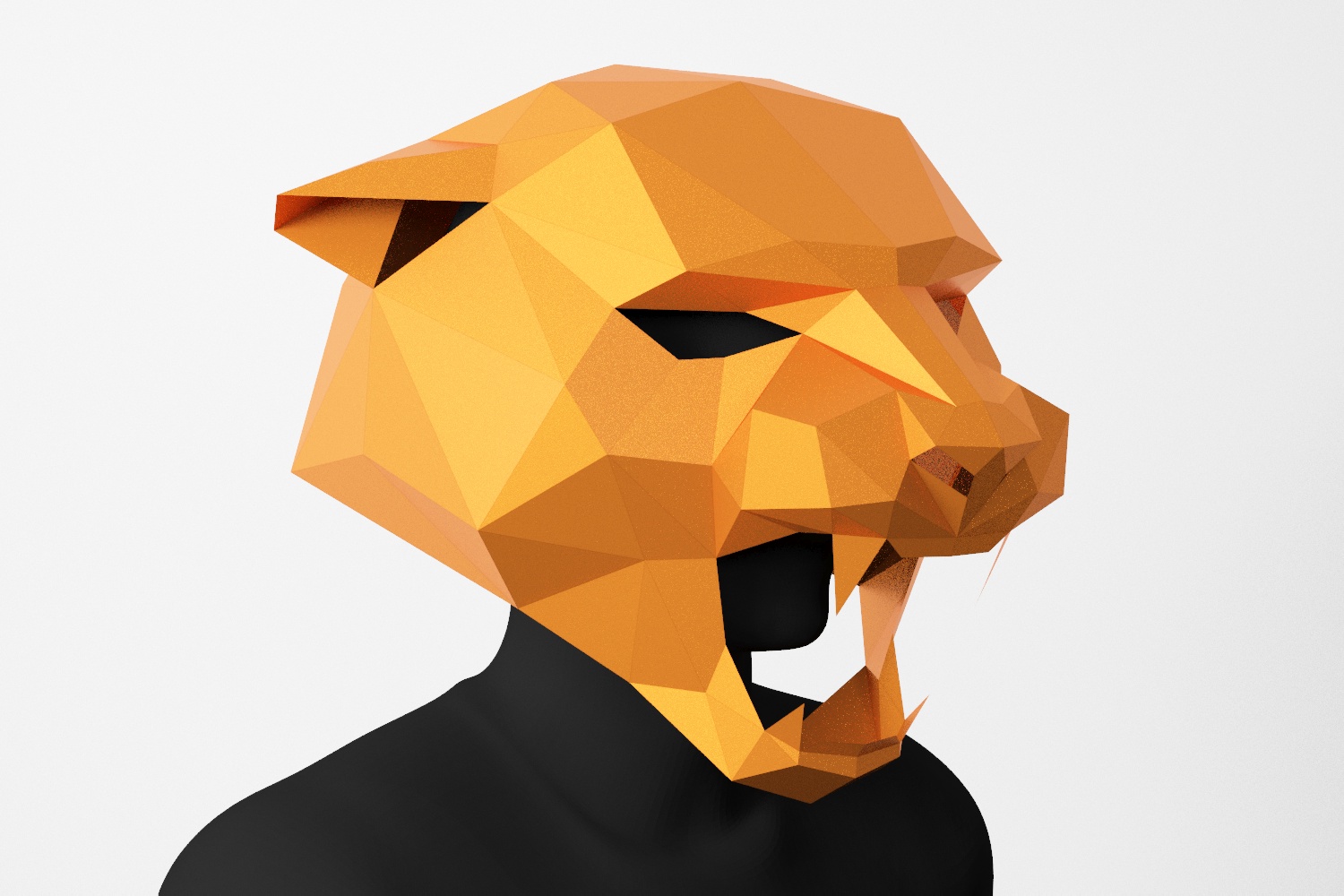 Panther mask with an open mouth and a forward-leaning shape. Clear build and defined expression.