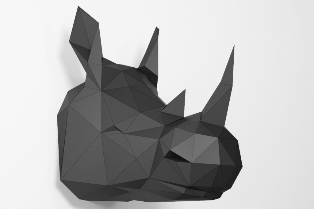 A large rhino head sculpture with realistic scale, designed as a wall-mounted polygonal model.