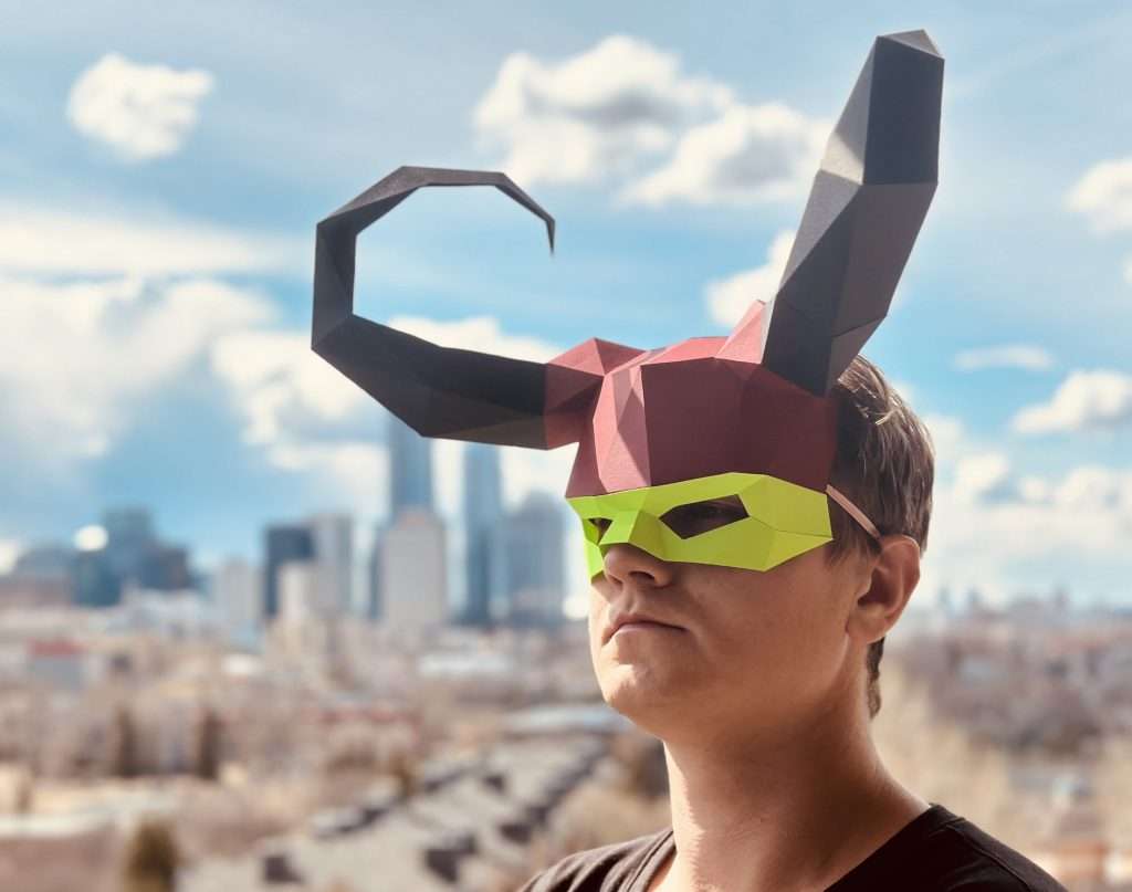 A mask with mantis-like horns, built as a compact polygonal form with a distinct silhouette.