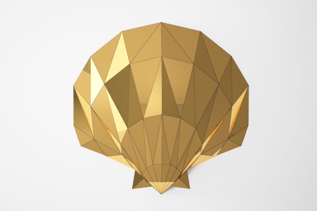 A seashell sculpture with a faceted surface, designed for both cardboard assembly and plastic panel construction.
